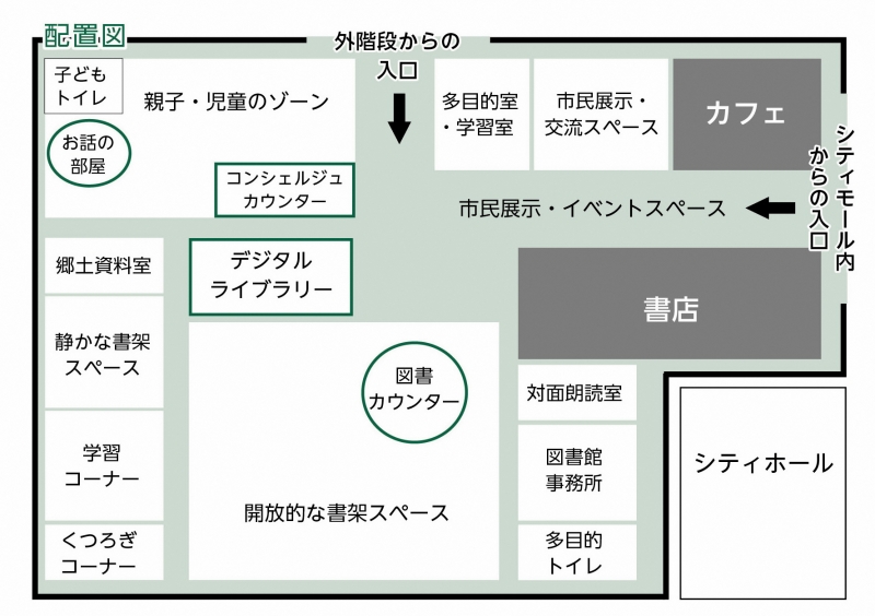 電子書籍の表紙が万華鏡のように映し出されるものや、市に関する情報を写真や動画で観ることができる大画面ディスプレイを設置します。そのほか、オンライン授業ができるスタジオや学習まんがを見ることができる設備なども整備します。